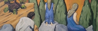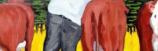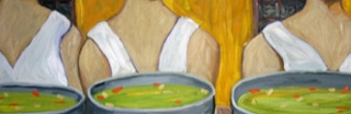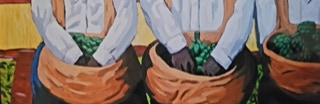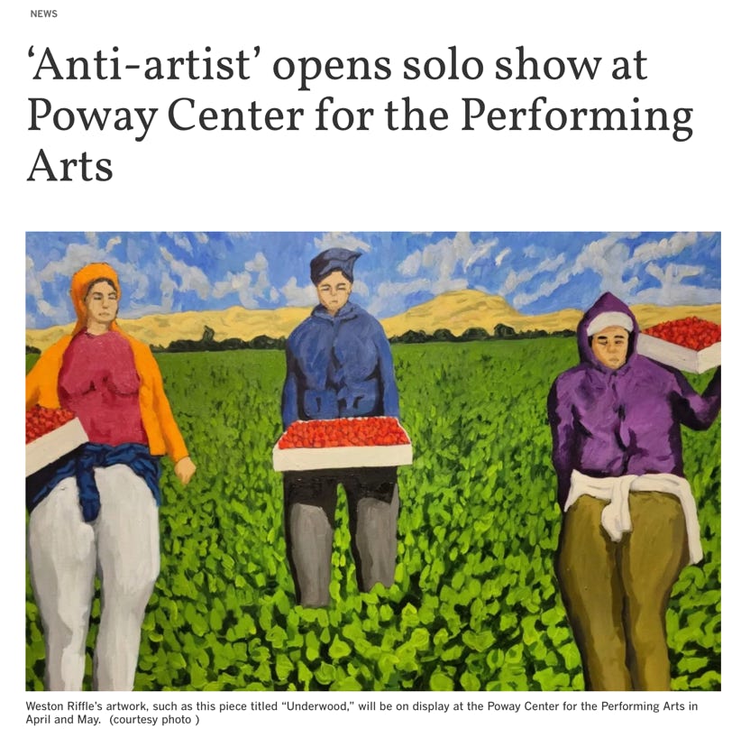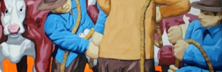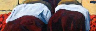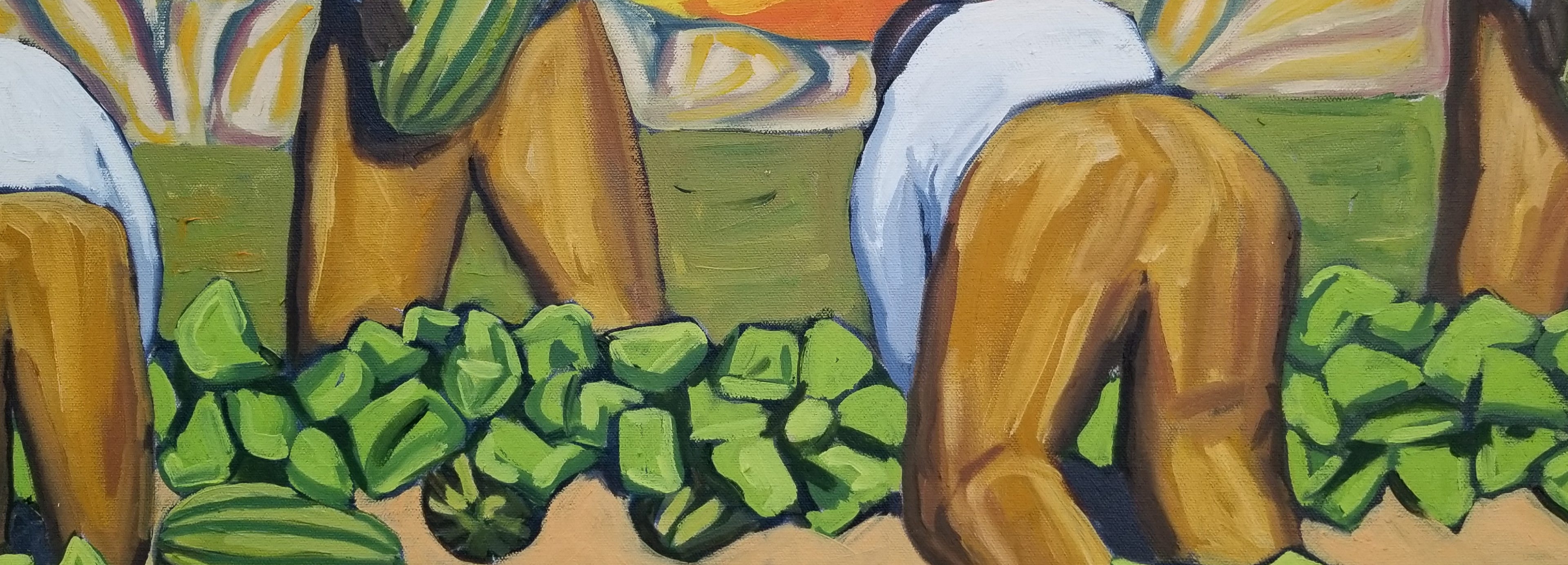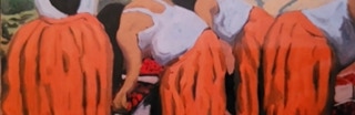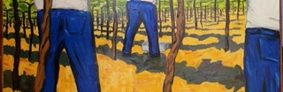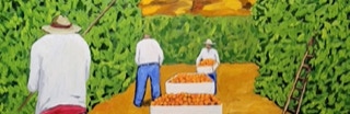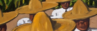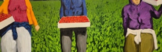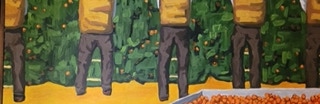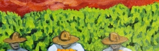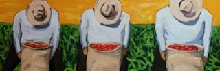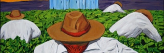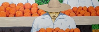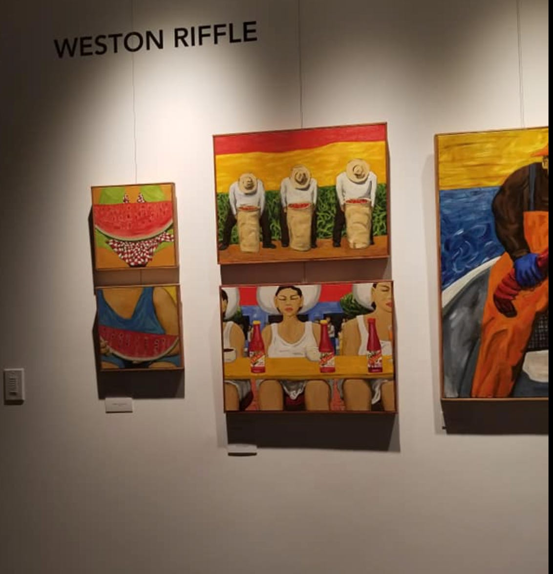 "In style and subject matter Weston Riffle's work brings to mind the social realism movement that had its heyday in America and Mexico between the two world wars-a realism that both celebrated working people and critiqued the socio-economic and political forces that create inequality. At first glance, the brilliantly colored paintings of farm workers and fishermen seem to be simply celebrations of California rural life- and they certainly are that -until we notice the hidden faces and the repetition of identical figures. It is as if the farm workers in their anonymity are just so many interchangeable parts in a larger machine. Or perhaps the repetitive nature of their back-breaking work has rubbed the individuality out of them. The political makes itself known through the personal."